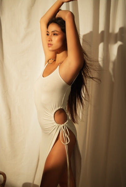 Robe fendue sur le coté avec attaches. Fines bretelles.